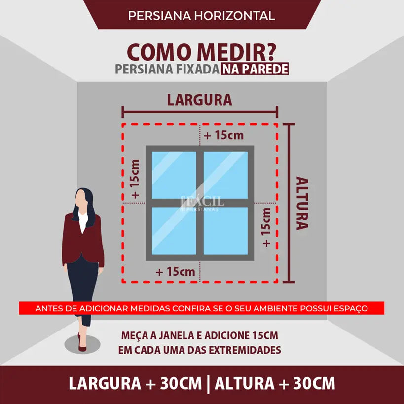 Para instalações de persianas dentro do vão da janela, deve-se medir as dimensões das janelas e, ao realizar o pedido, reduzir 1cm da largura e da altura das persianas.