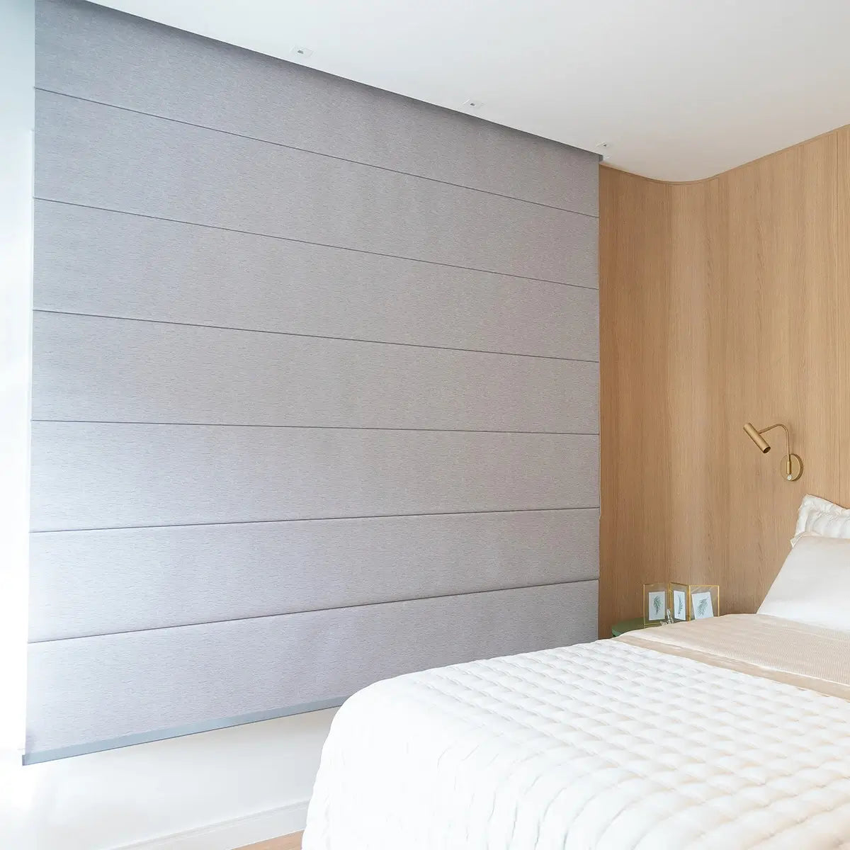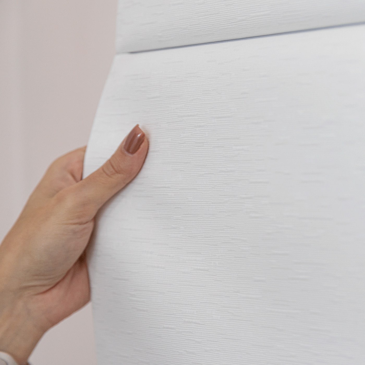 O tecido texturizado da Persiana Romana Blackout Texturizada é composto por 100% poliéster, o material tem o aspecto aveludado no verso e na frente, uma camada texturizada que traz muita sofisticação.