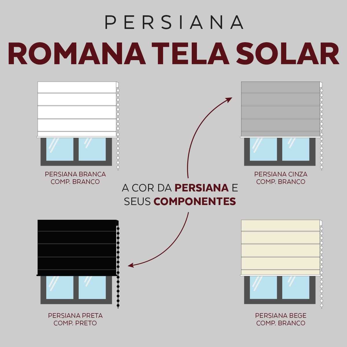 O modelo Persiana Romana Tela solar é o mais durável entre todos os modelos de cortinas e persianas do mercado, pois a estrutura da persiana e seus suportes são fabricados a partir de perfil de alumínio ultra resistente, e tecido é composto por trama de fio polimérico revestido com PVC, conferindo resistência ao tecido.