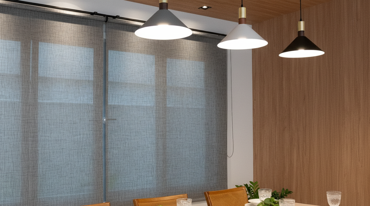 Persianas translúcidas permitem a entrada de luz natural de maneira suave e difusa, não fornece 100% de privacidade e é um tecido mais decorativo. Ideais para salas de estar e quartos.
