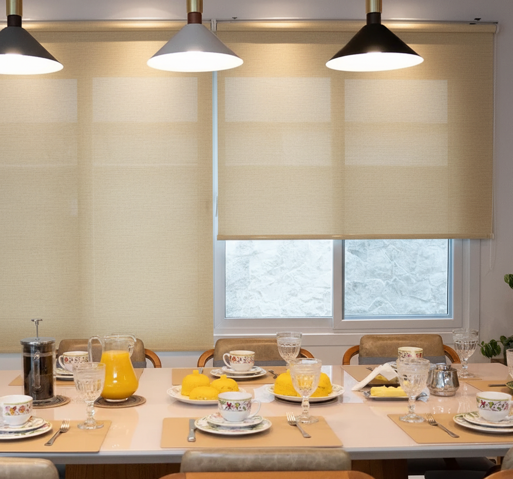 Persianas translúcidas permitem a entrada de luz natural de maneira suave e difusa, não fornece 100% de privacidade e é um tecido mais decorativo. Ideais para salas de estar e quartos.
